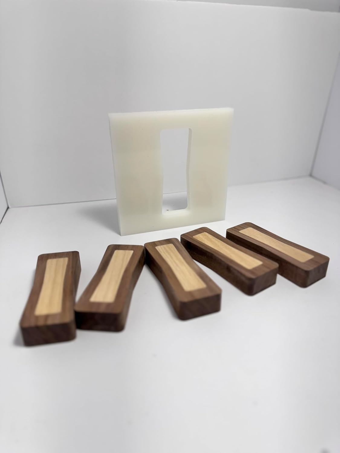 Answer 1: The set includes five premium wooden inlays, each measuring 4 x 1.5 x 0.75 inches, made from high-quality walnut and white ash wood.